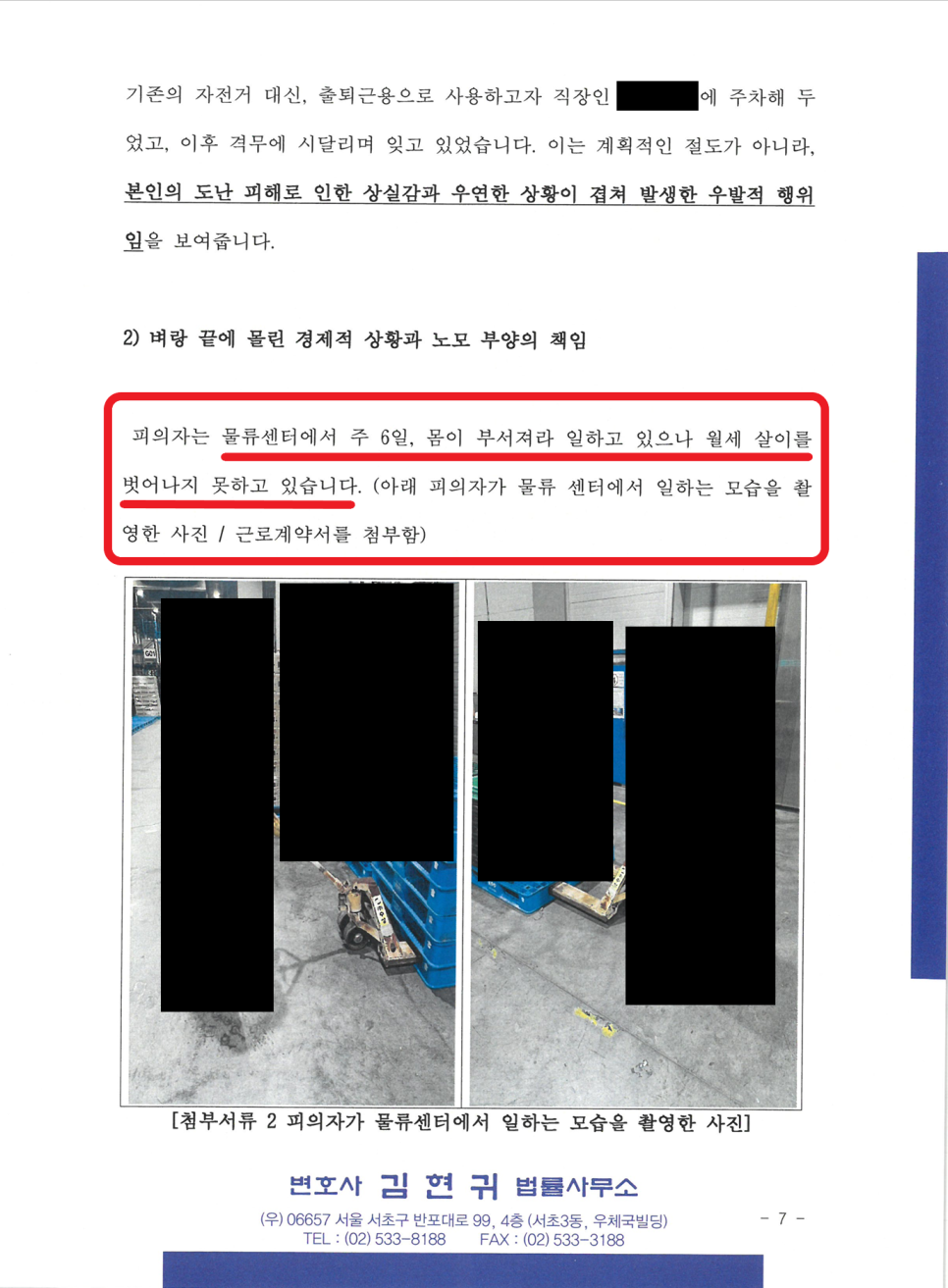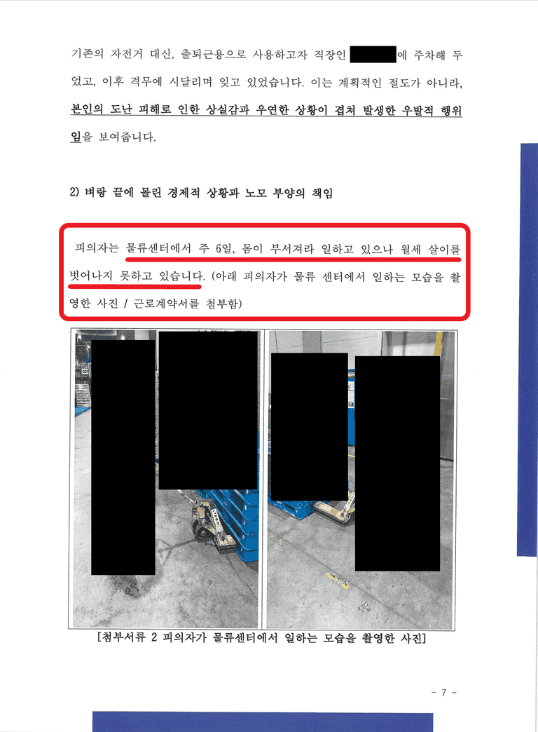 - 설상가상으로 그 월세 집에서 모친을 자신의 집에서 부양하며 살고 있음. 자신의 병원비조차 아껴가며 어머니의 생계와 채무 해결을 돕고 있어, 모은 돈이 거의 없는 절박한 상황에서 범행한 것임