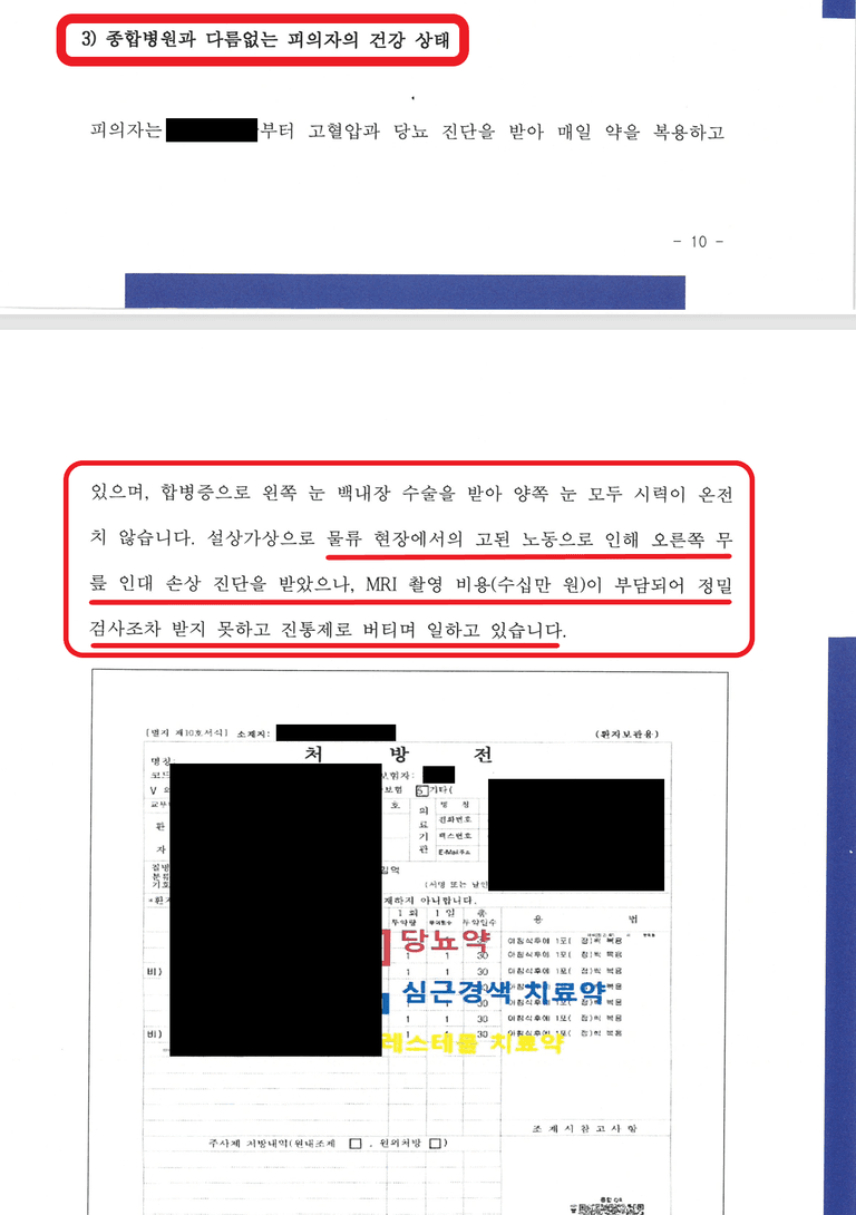- 심지어 물류 현장에서의 고된 노동으로 인해 오른쪽 무릎 인대 손상 진단을 받았으나, MRI 촬영 비용(수십만 원)이 부담되어 정밀 검사조차 받지 못하고 진통제로 버티며 일하고 있는 실정임