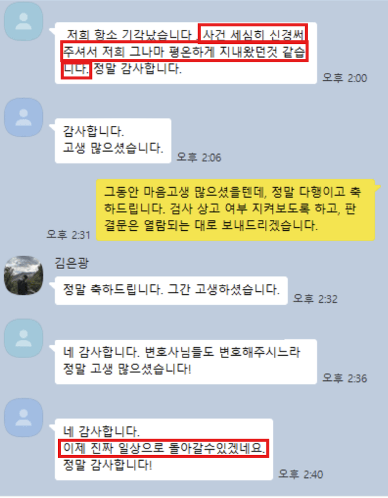 어제 '무죄'가 확정되었고, 결과를 전해드린 뒤 이런 메시지를 받았습니다.