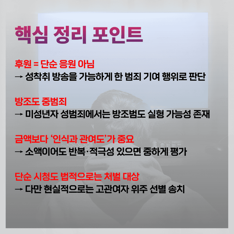 특히 이번 사건은 미성년자 성착취물 제작과 관련한 방조범 처벌의 기준을 제시한 사례로 주목받고 있습니다. 과거에는 제작자나 유포자 처벌에 집중됐다면, 이번 사건을 통해 시청자와 후원자에게까지 형사책임을 묻는 방향으로 수사 범위가 확대됐기 때문입니다.