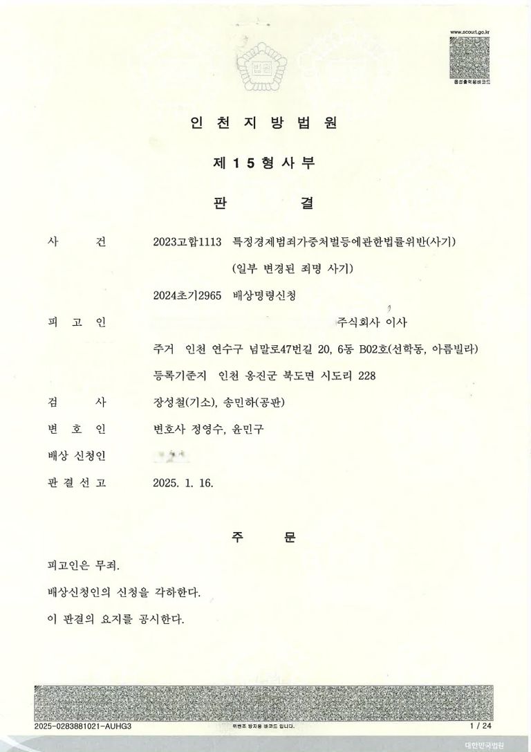 이 사건은 의뢰인에 대한 1심 재판이 개시되기 전인 2024. 5. 24. 수임하였는데, 2025. 1. 16. 1심 무죄 판결이 선고되었으니 약 8개월 만에 좋은 결과가 나온 사례입니다.