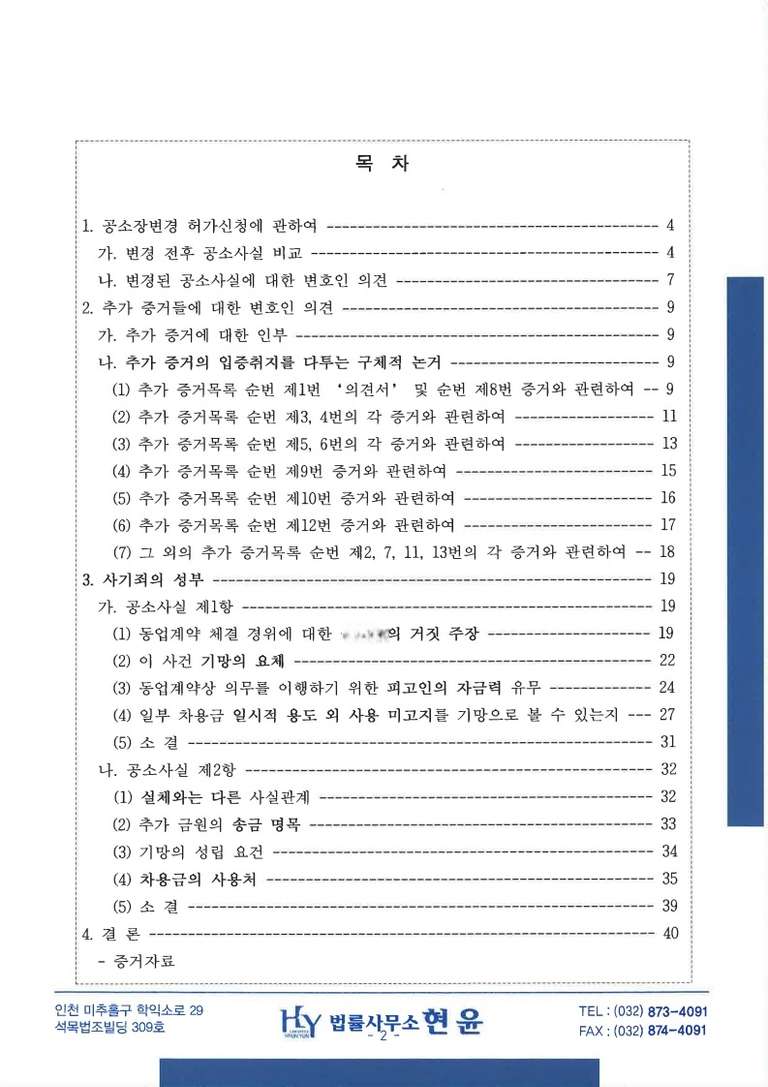 그래서, 아래 변론요지서 목차와 같이 열심히 무죄 변론하여 성공을 거두었습니다. 목차를 살펴보시면 제가 어떤 방법으로 변론했는지, 변론을 얼마나 열심히 하였는지를 알 수가 있을 것입니다.