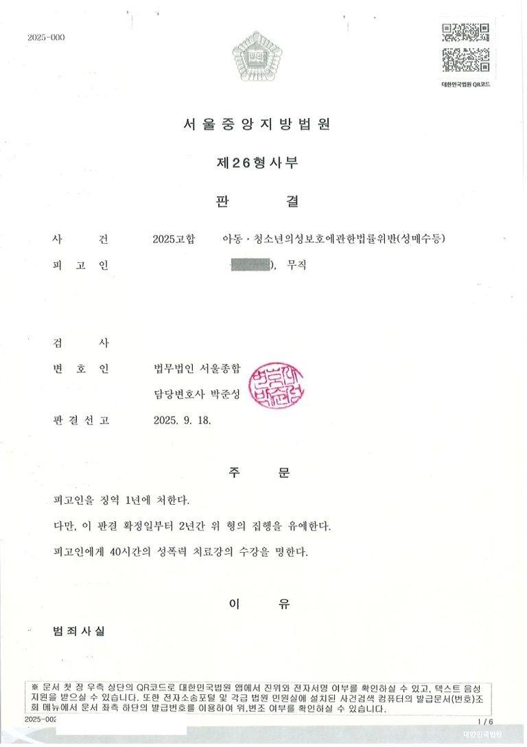 결과는 징역 1년 및 집행유예 2년, 취업제한명령 면제였습니다.