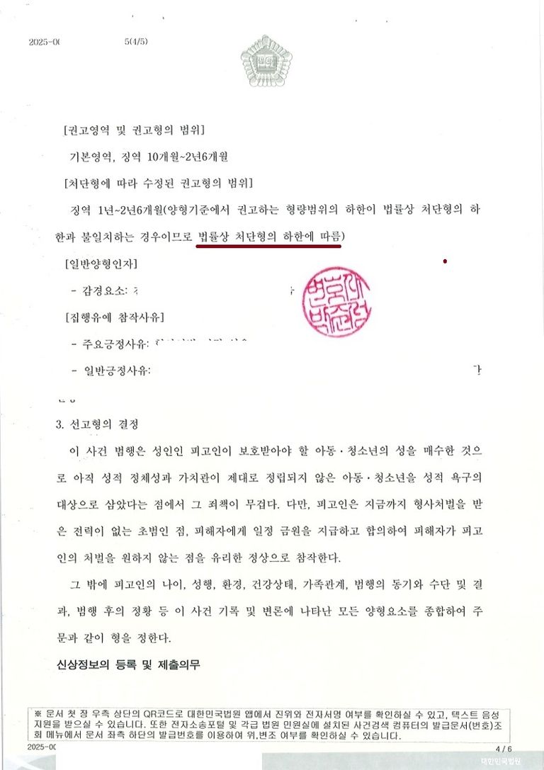 법원의 양형 권고영역 및 법률상 처단형 하한 범위를 종합하여 최하한선에 맞게끔 집행유예 판결이 있었고 부수처분인 취업제한명령도 면제되었습니다.