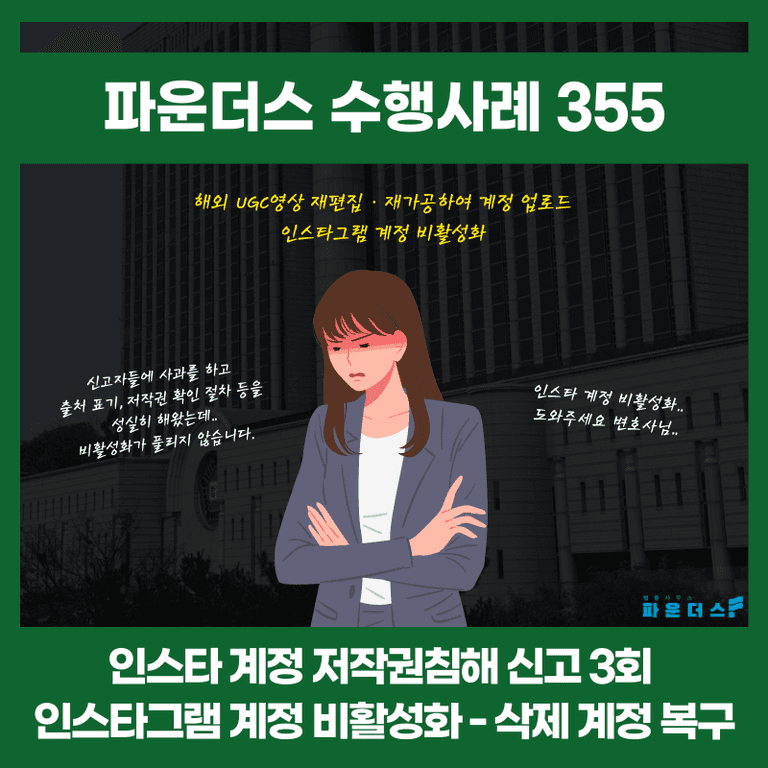 사건의 개요: 의뢰인은 해외 UGC 영상을 재편집ㆍ가공하여 자신의 인스타그램 계정에 업로드한 점이 저작권 침해로 문제되어 총 3차례 신고를 당했고 이후 계정 비활성화로 인해 법적 조력을 요청하였습니다.