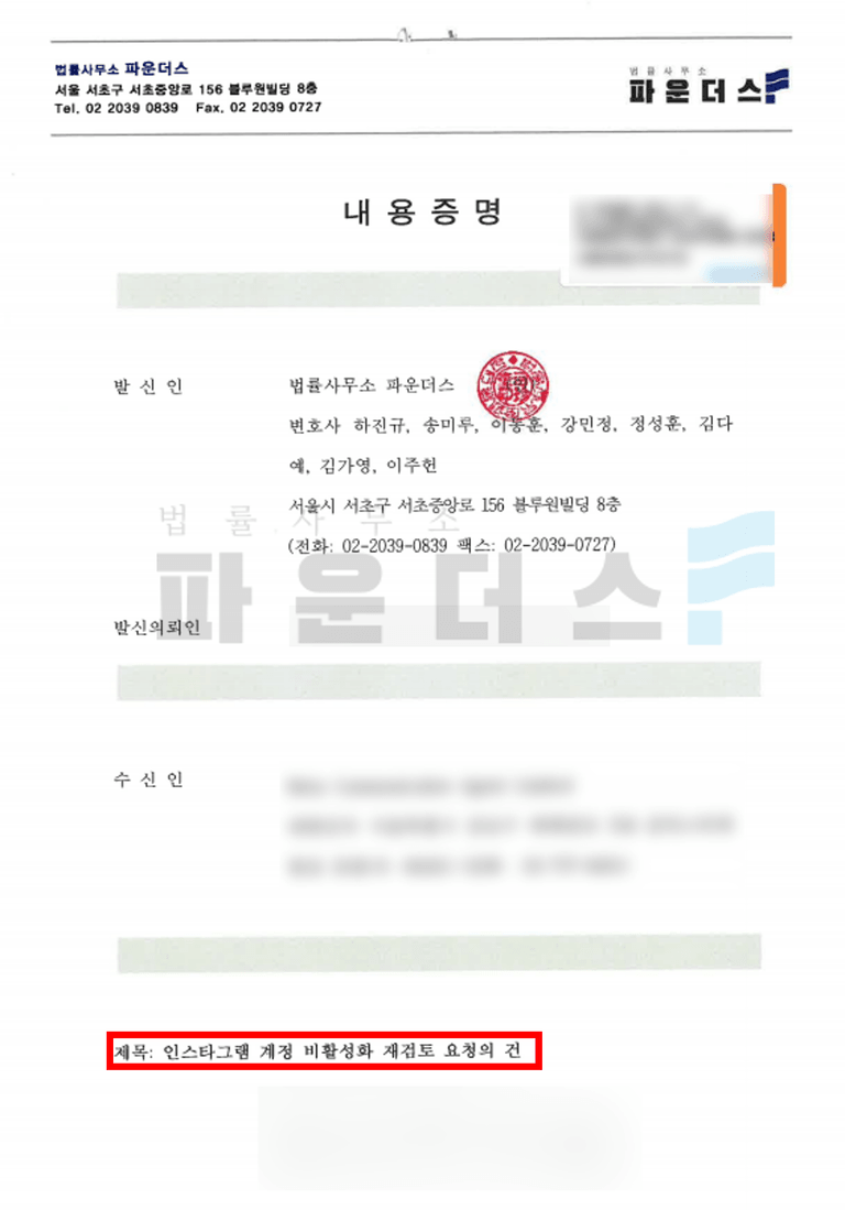 이에 변호인은 내용증명을 작성하여 인스타그램 본사 측에 발송했습니다.
