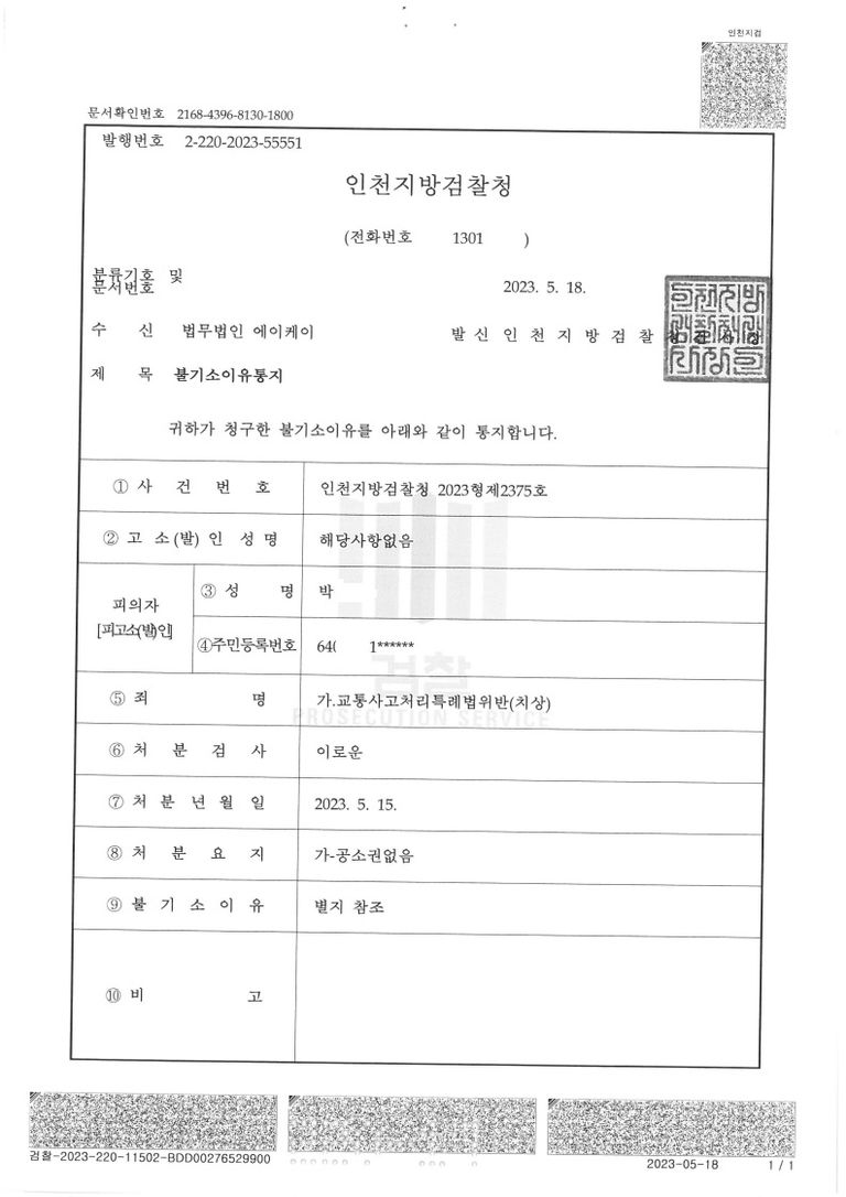 결론적으로, 검사는 신호위반 사고가 아니라 우회전시 주의의무 위반 사고라고 결론 내리고, ‘공소권 없음’ 처리하였습니다.
