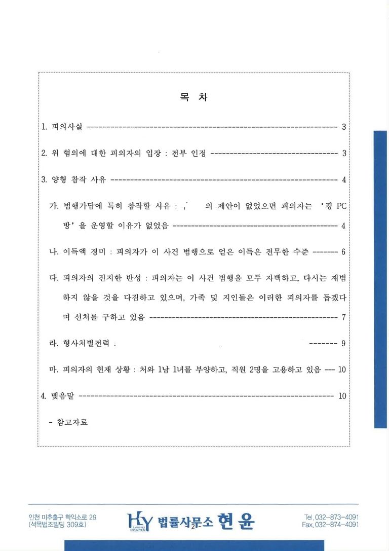 이 사건 범행은 다른 사람 주도하에 시작된 것으로 피의자에게는 범행가담에 특히 참작할 사유가 있고, 실제로 피의자가 이 사건 범행으로 얻은 이득은 전무한 수준이며, 피의자는 이 사건 범행을 모두 자백하고 다시는 재범하지 않을 것을 다짐하고 있고, 가족들 및 주변 지인들은 이러한 피의자를 돕겠다며 선처를 구하고 있으며 피의자는 현재 가족은 물론 사실상 직원의 생계까지 책임지고 있는바 이러한 상황을 빠짐없이 살피시어 피의자에게 구약식(벌금) 처분을 해 주실 것을 간곡히 청하는 바입니다.