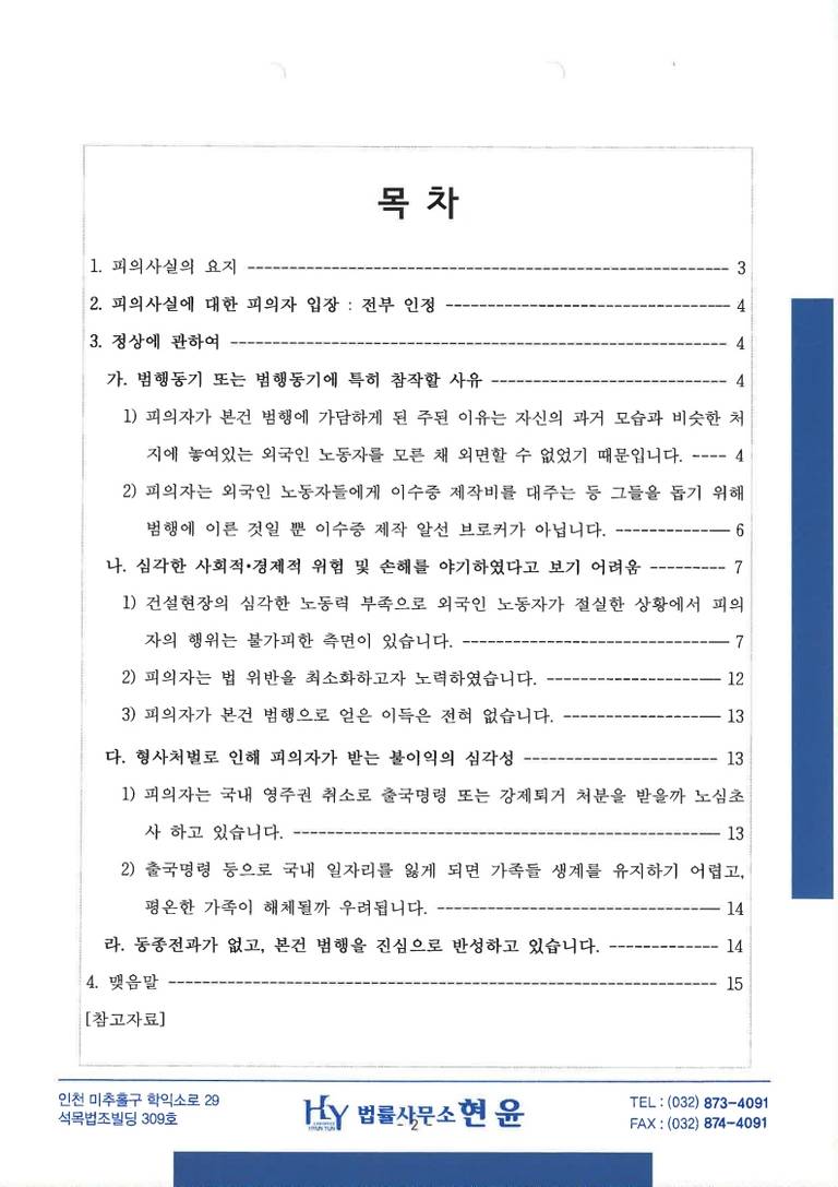 피의자에게는 여러 참작 사유들이 존재하는바, ❶특히 우리나라 건설업 등 산업현장이 불법체류 외국인 노동자들을 채용할 수밖에 없는 절박한 사정이 있다는 점, ❷피의자가 자신과 비슷한 처지에 놓여있던 외국인 노동자들을 도와주려는 목적으로 본건 범행에 이르게 된 점, ❸피의자는 이 사건으로 아무런 이익을 취득한 바 없다는 점, ❹그럼에도 이 사건으로 인해 영주권이 박탈되는 것은 피의자와 그의 가족들에게 너무나 가혹한 결과라는 점 등을 깊이 살피시어 피의자에게 법이 허용하는 최대한의 관용을 베풀어 주시기를 간곡히 청하는 바입니다.