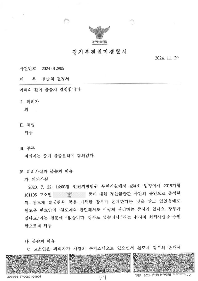 피의자는 2020년 7월 22일 인천지방법원 부천지원 2019가합101105 정산금 반환 사건에서 증인으로 출석하여 천도재 장부가 존재함을 알고 있었음에도 불구하고 법정에서 장부가 없다고 허위 증언하여 위증