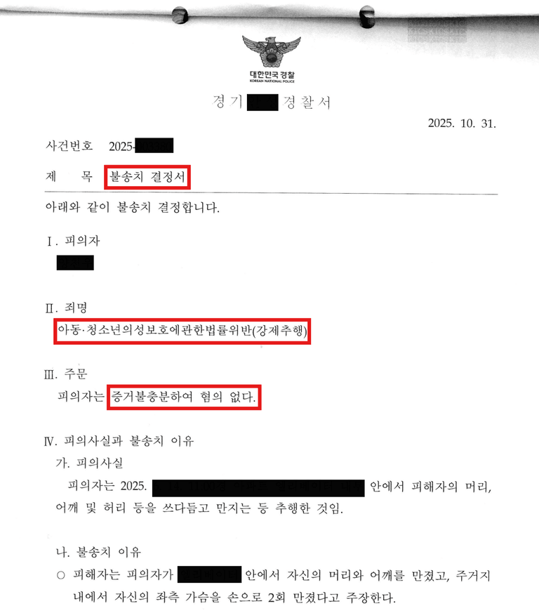 저는 수사 단계에서 이 사건을 “미성년자 강제추행 사건”으로 묶이지 않도록 가장 신경을 썼습니다.