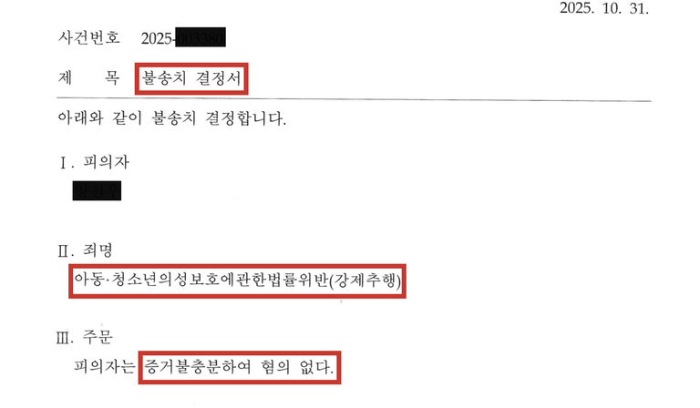 그 결과, 성매수 유인 혐의와는 별도로 강제추행 혐의에 대해서는 증거 불충분을 이유로 불송치 결정을 하였습니다.