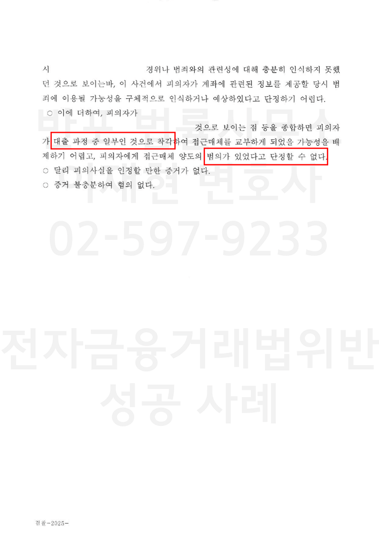 또한, 유사 사안에서 대출 빙자 기망에 따른 접근매체 제공은 전자금융거래법 위반의 고의를 인정하기 어렵다는 다수의 판례와 수사 실무 기준을 종합하여 의견을 제출하였습니다.
