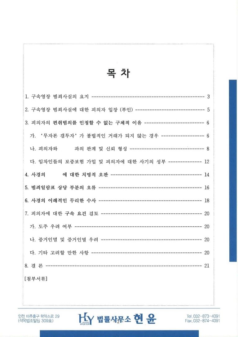 제가 작성한 변호인의견서의 목차를 보시면 제가 어떻게 열심히 변론하였는지 짐작하실 수 있습니다.