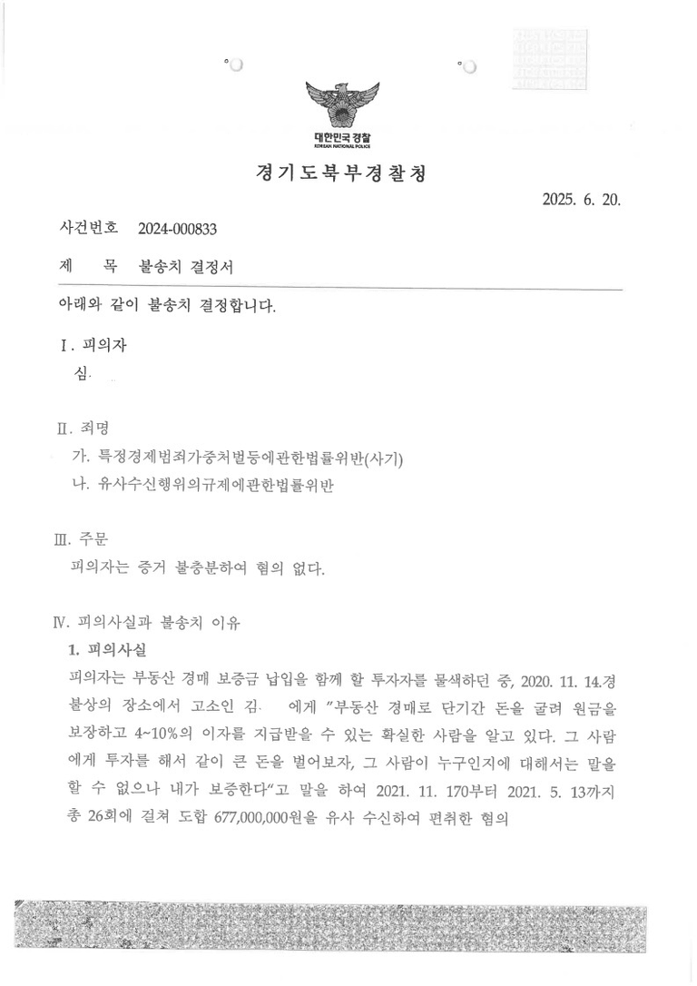 피의자는 부동산 경매 보증금 납입을 함께 할 투자자를 물색하던 중 2020. 11. 고소인에게 “부동산 경매로 단기간 돈을 굴려 원금을 보장하고 4 ~ 10%의 이자를 지급 받을 수 있는 확실한 사람을 알고 있다. 그 사람에게 투자를 해서 같이 큰 돈을 벌어보자. 그 사람이 누구인지에 대해서는 말을 할 수 없으나 내가 보증한다.”라고 거짓말을 하여 2021. 11. 17.부터 2021. 5. 13.까지 총 26회에 걸쳐 합계금 677,000,000원을 편취하여 특정경제범죄가중처벌등에관한법률위반(사기)