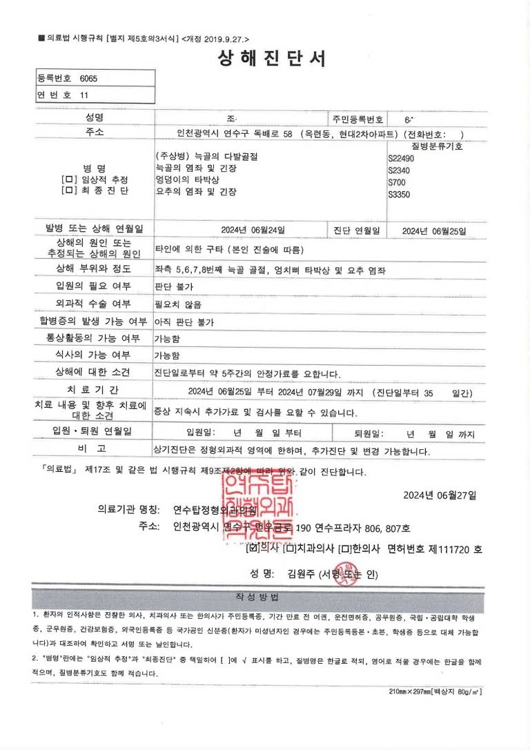 피의자는 2024. 6. 23. 21:38경 인천 소재 노래연습장에서, 고소인과 캔맥주를 나누어 마시고 노래를 부른 후 시간당 5만 원을 주는 조건으로 모텔로 가 고소인과 성관계를 갖고 싶었으나, 고소인이 “그냥 집으로 가겠다.”라고 말하자 화가 나 고소인에게 “네년이 한 것이 무엇이 있느냐, 아까 준 팁 6만 원을 다시 내놔라.”라고 욕하며 고소인을 패대기치듯이 넘어뜨려 고소인의 핸드백을 빼앗고, 인도 경계석에 가슴을 부딪히게 하여 고소인에게 전치 5주의 늑골 다발골절 등의 상해를 가하여 강도상해