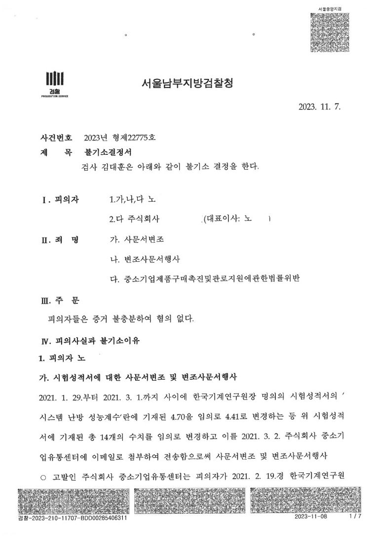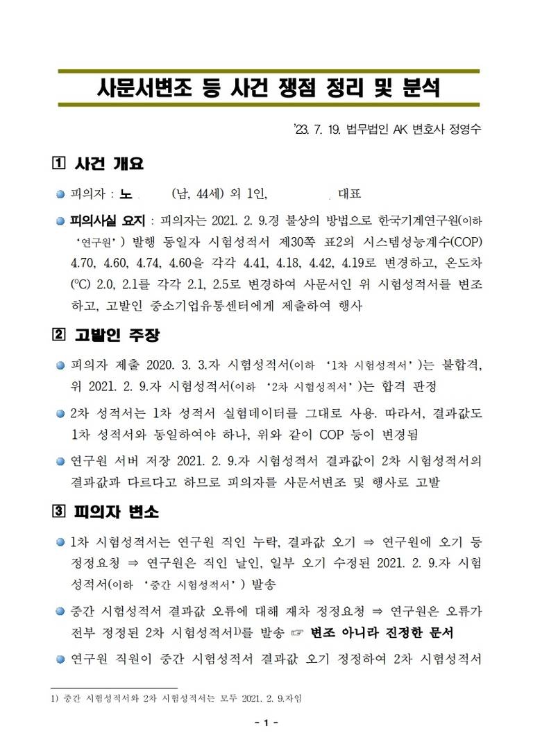 피의자는 2021. 2. 9.경 불상의 방법으로 한국기계연구원(이하 ‘연구원’) 발행 동일자 시험성적서 제30쪽 표2의 시스템성능계수(COP) 4.70, 4.60, 4.74, 4.60을 각각 4.41, 4.18, 4.42, 4.19로 변경하고, 온도차(oC) 2.0, 2.1를 각각 2.1, 2.5로 변경하여 사문서인 위 시험성적서를 변조하고, 고발인 중소기업유통센터에게 제출하여 행사