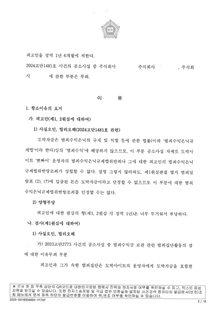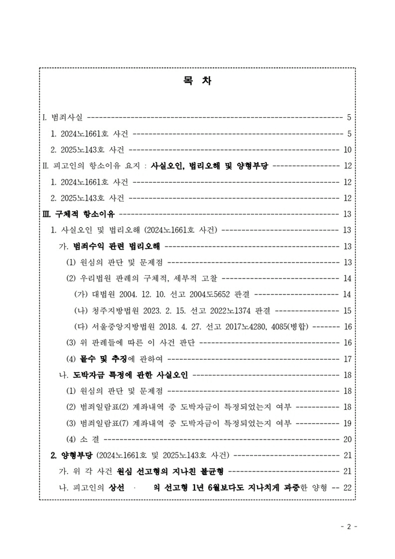 1. 피고인은 2024노1661호 사건에서 원심이 ❶‘도박참가자 입금의 이른바 판돈에 해당하는 도박자금’을 범죄수익으로 인정한 부분, ❷이로인해 범죄수익은닉방조를 유죄로 인정한 부분은 각 부인하고, 그외 나머지 부분은 모두 인정하는바, 아울러, 원심의 합계 2년의 징역형은 과중한 양형이라는 입장입니다.