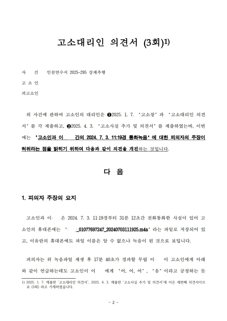첨부한 저의 고소대리인 의견서(3회) 첫번째 페이지를 참조하세요.
