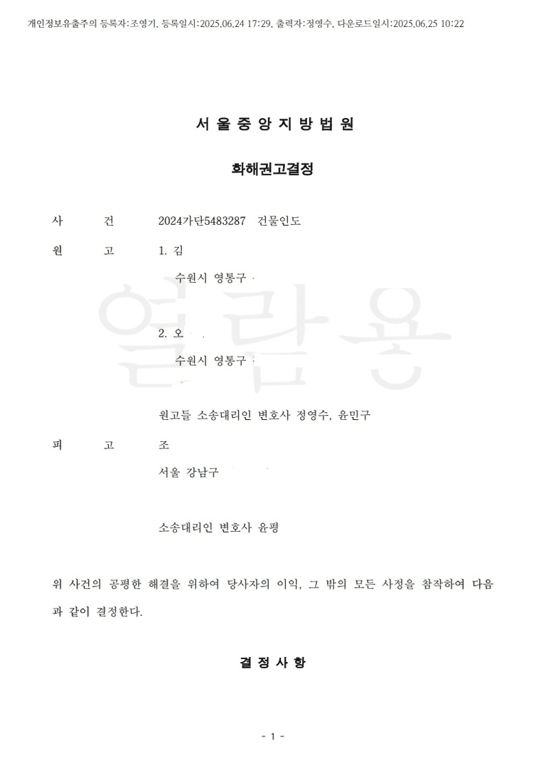 그래서, 본 변호인은 준비서면에서 아래와 같은 취지 등으로 강력하게 주장하여, 법원에서는 피고는 원고들에게 손해배상금 500만 원을 지급하고 아파트를 비우라는 취지로 화해권고결정을 하고 양자가 모두 받아들여 재판이 종결되었습니다.