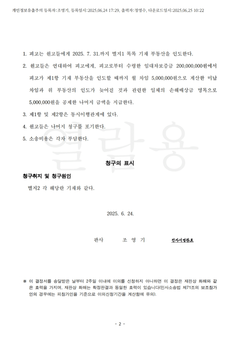 원고들은 자신들도 이 사건 아파트에 입주해야하는 상황이라 재계약이나 임대차계약 갱신을 원하지 않았지만, 피고 아이의 탄생을 축하하며 피고가 새로 이사할 곳을 마련할 수 있도록, 기존 계약의 만기일을 6개월 미루어 주는 취지로, 임대차 기간 만기일을 2023. 8. 2.로부터 6개월 후로 연장한 2024. 2. 2.까지로 변경하여 주었는데, 피고는 6개월 후로도 계속 퇴거하지 않고 2년 자동 연장을 주장하여 원고들이 명도소송을 제기함