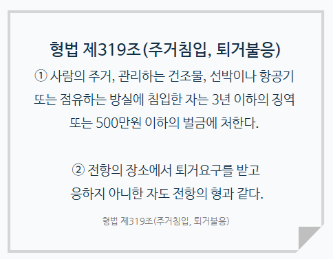 주거침입이라는 단어가 각종 매체와 일상에서 많이 언급되어서 언뜻 가볍게 들릴 수 있습니다. 하지만 실제로는 주거침입죄는 3년 이하의 징역 또는 5백만원 이하의 벌금이라는 결코 가볍지 않은 죄입니다.
