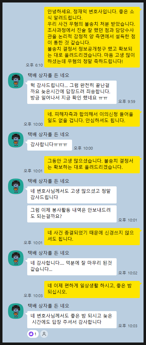 담당 수사관은 제가 제출한 자료와 변론을 모두 받아들여 A씨를 검찰에 기소하지 않고 불송치 결정을 내렸습니다. 하지만 이 결정은 단순히 운이 좋았던 것이 아닙니다. 치밀한 자료 수집과 변론 전략, 그리고 A씨의 상황을 수사관에게 효과적으로 전달한 결과였습니다. 그덕에 기쁜 소식을 의뢰인과 함께 나눌 수 있었습니다.