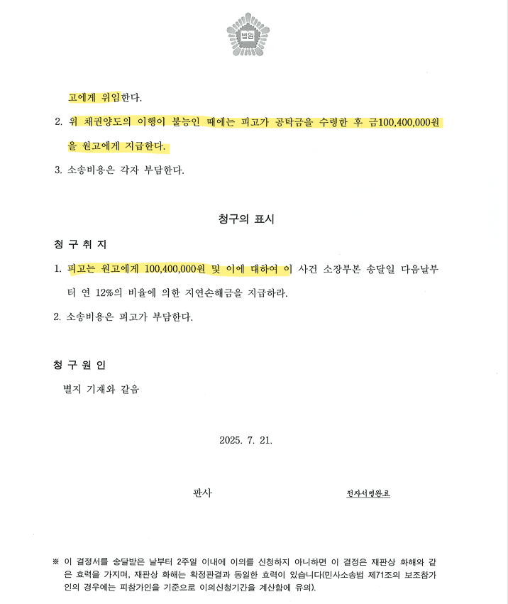 법원은 화해권고결정을 통해, B기관이 공탁금 중 약 1억 400만원에 해당하는 출급청구권을 A회사에 양도하고,