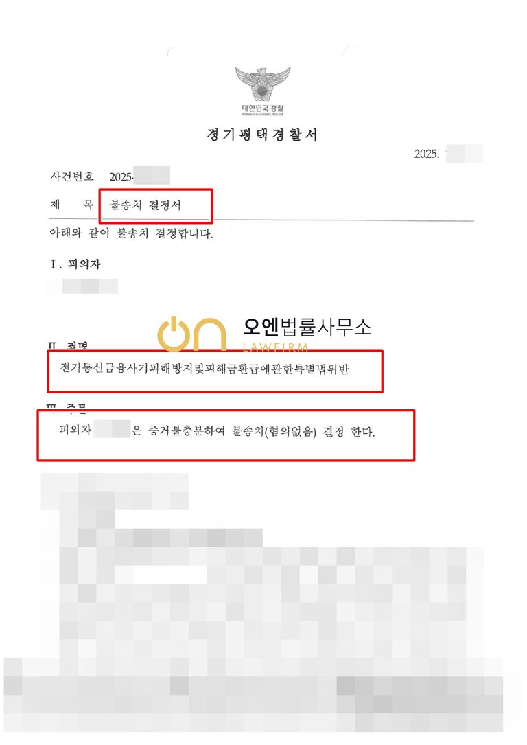 수사기관은 담당변호사의 주장을 받아들여, 불송치 결정(혐의없음)을 하였습니다.