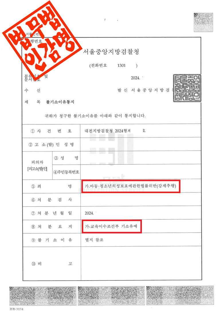 대전지방검찰청은 이 사건에 대해 다음과 같은 사유로 불기소 결정을 하였습니다.