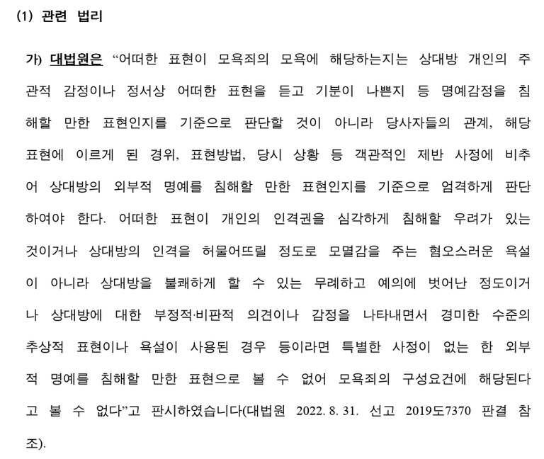 많은 분이 욕설이나 비속어가 들어가면 무조건 모욕죄가 성립한다고 오해하곤 합니다. 하지만 법리적으로 파고들면 방어할 수 있는 논리는 분명히 존재하는데요.
