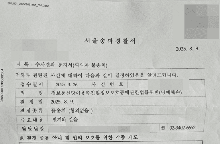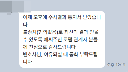 보통 결과가 나오기까지 몇 달씩 걸리는 것이 일반적이지만, 이번 사건은 매우 이례적으로 경찰 조사 당일 현장에서 수사관으로부터 불송치(혐의없음) 의견으로 사건을 끝내겠다는 확답을 받아냈습니다.