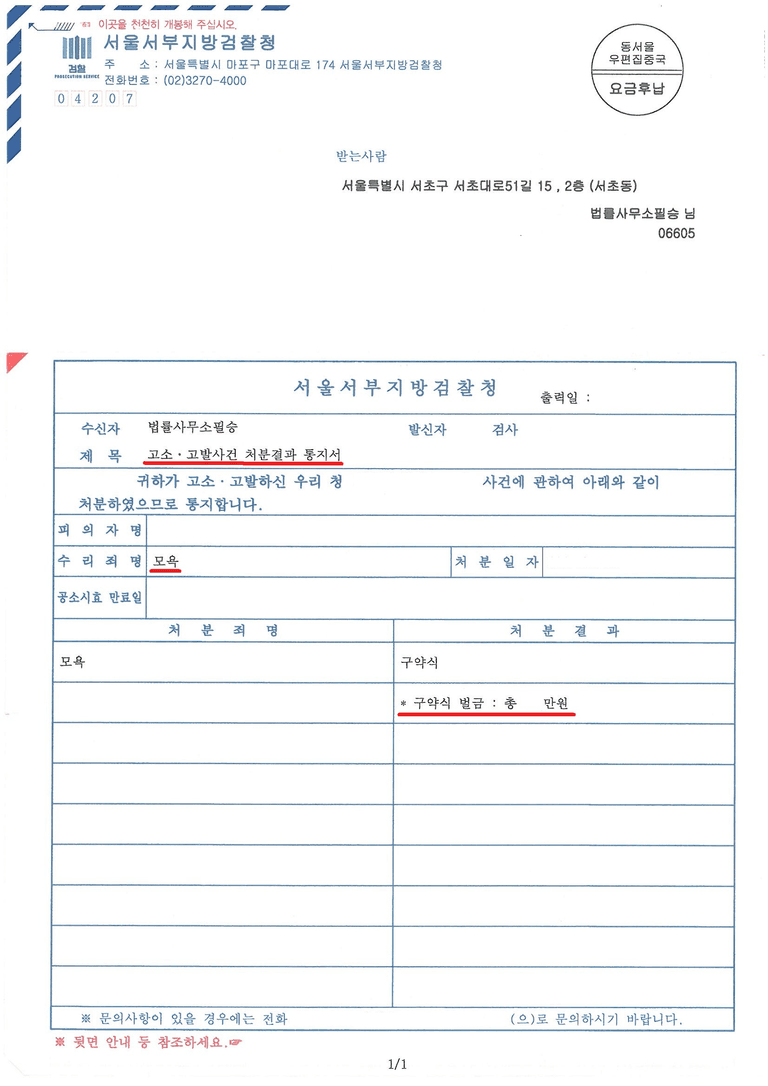 특정성 성립과 모욕죄 성립요건에 대한 꼼꼼하고 법리적인 주장이 받아들여져 피의자의 모욕죄가 인정되어 서울서부지방검찰청은 피의자를 기소처분하였고, 법원 역시 피의자에게 벌금형을 선고하였습니다.
