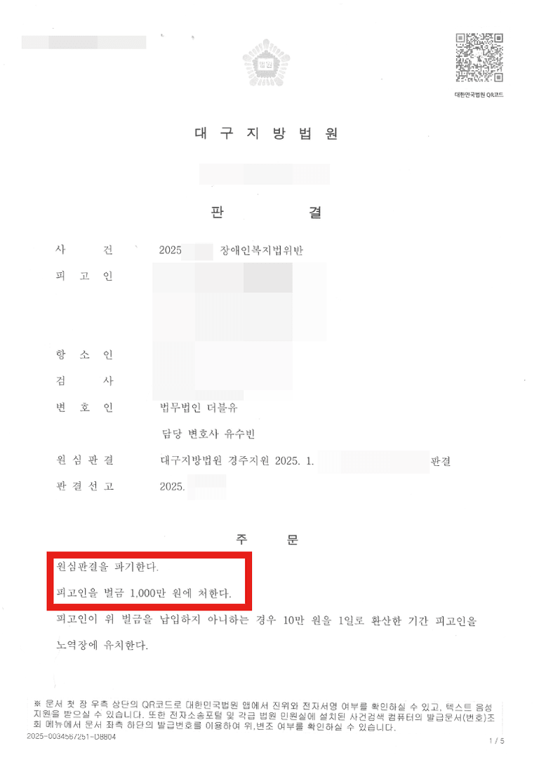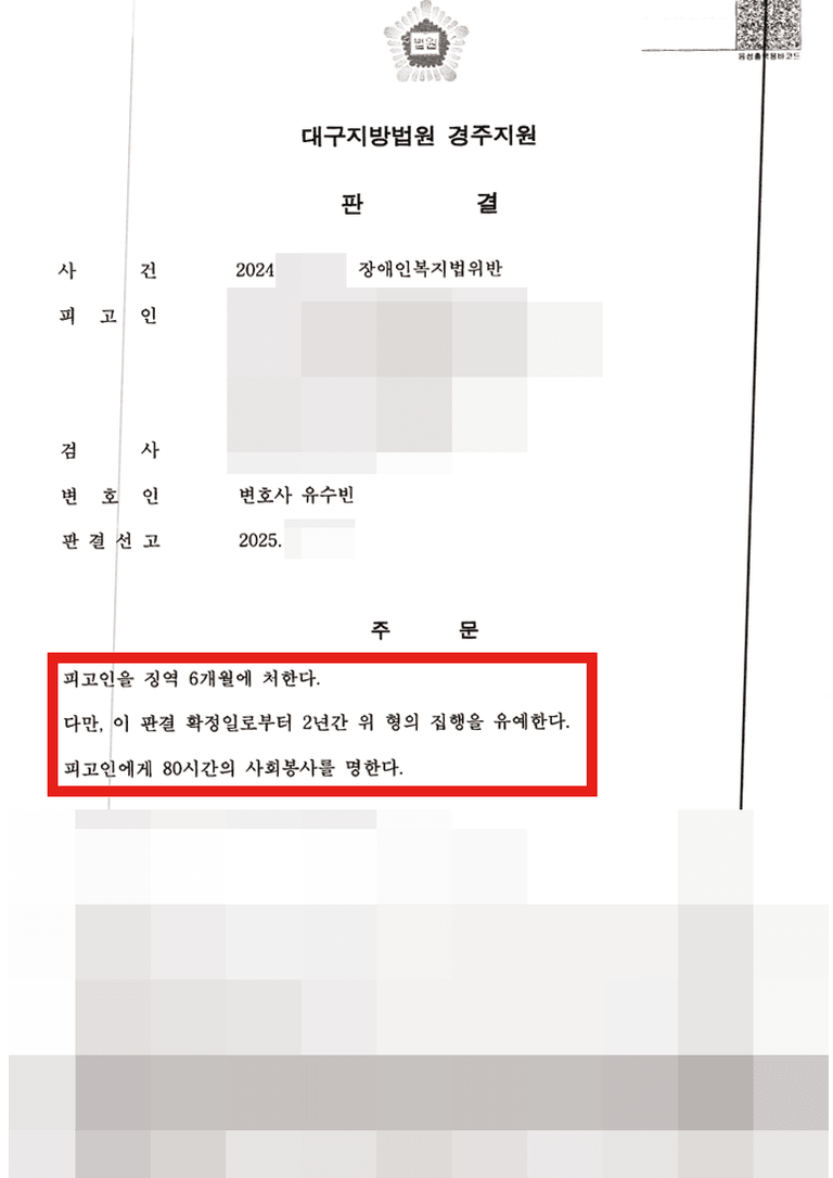 오늘은 실제 대구장애인복지법위반 사건에서 1심의 집행유예 판결이