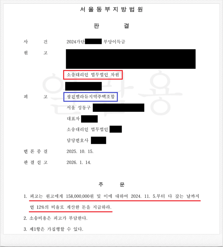 저는 광진벨라듀 지역주택조합을 상대로 한 조합원 분담금 반환 소송에서 단순히 승소 판결을 이끌어내는 데 그치지 않고, 실제로 납입금을 환불받은 성공 사례를 다수 보유하고 있습니다.