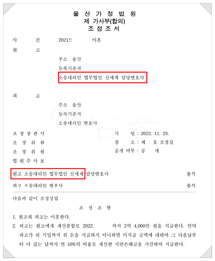 조정이혼 재산분할 2억 4,000만원으로 합의가 이루어졌습니다.