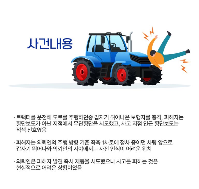 의뢰인은 트랙터를 운전해 정상적으로 도로를 주행하던 중, 좌측에서 우측으로 갑자기 뛰어나온 보행자를 충격하였습니다. 피해자는 횡단보도가 아닌 지점에서 무단횡단을 시도하였고, 사고 지점 인근의 횡단보도 신호는 적색이었습니다.