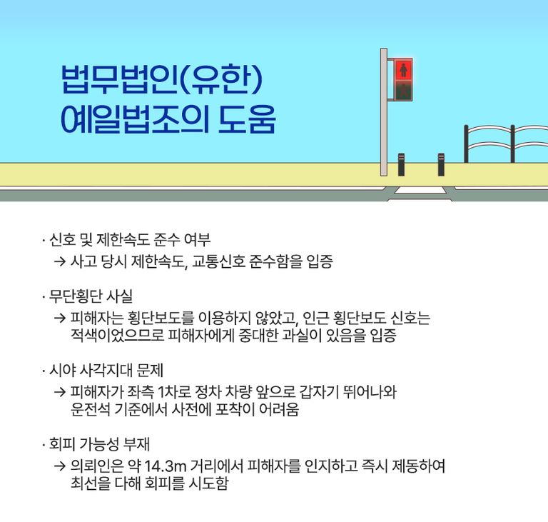 의뢰인은 사고 당시 제한속도를 초과하지 않았고, 교통신호 역시 모두 준수하고 있었습니다.무단횡단 사실
