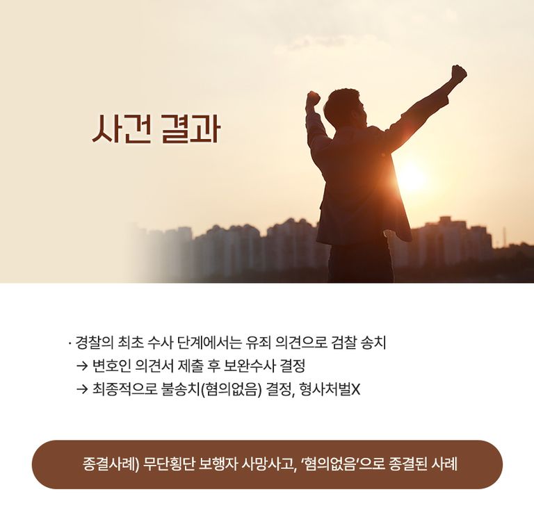 이 사건은 사망사고임에도 불구하고, 회피 가능성이 없었다는 점을 논리적으로 입증해 혐의없음 처분을 이끌어낸 사례입니다.