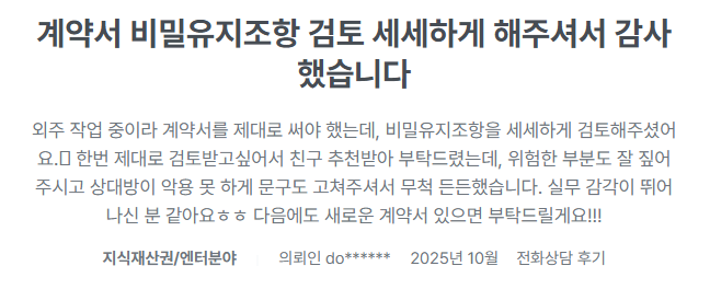의뢰인은 해당 계약서를 바탕으로 편집자 및 디자이너들과 안전하게 계약을 체결할 수 있었고, 프리랜서 보안 서약서까지 이중으로 받아두며 철통같은 보안 환경을 완성했습니다. 덕분에 의뢰인은 신상 유출에 대한 불안감 없이 오직 콘텐츠 제작과 방송에만 집중하며 성공적으로 채널을 키워나가고 계십니다.^^