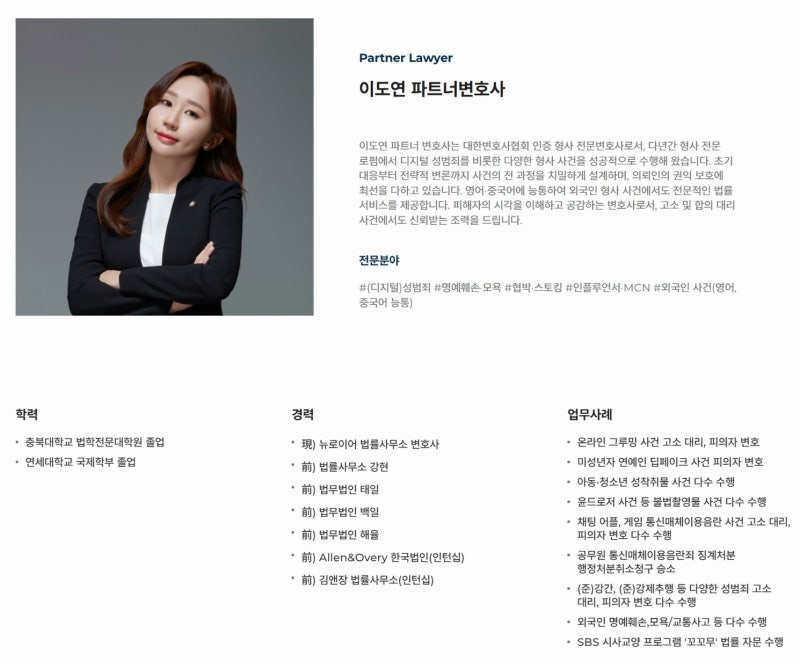 법률 조력을 드리고 있는 뉴로이어 법률사무소 디지털성범죄팀 이도연 파트너변호사입니다