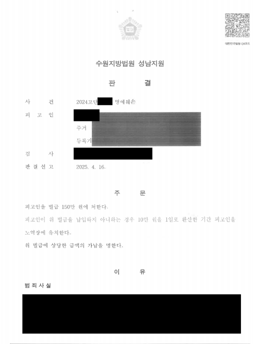 벌금형 선고와 명예 회복 법원은 무율의 주장을 받아들여 피고인(가해자)의 행위가 비방 목적으로 허위 사실을 적시한 명예훼손에 해당한다고 판단했습니다. 이에 따라 법원은 가해자에게 벌금 150만 원의 형사 처벌을 선고하였습니다. 이번 사례는 직장 내 앙심을 품고 증거까지 조작하여 무고한 상사를 괴롭힌 지능적 범죄에 대해 엄중한 법적 책임을 물음으로써, 억울한 누명을 쓰고 고통받던 의뢰인의 명예를 온전히 회복시켰다는 데 큰 의의가 있습니다.