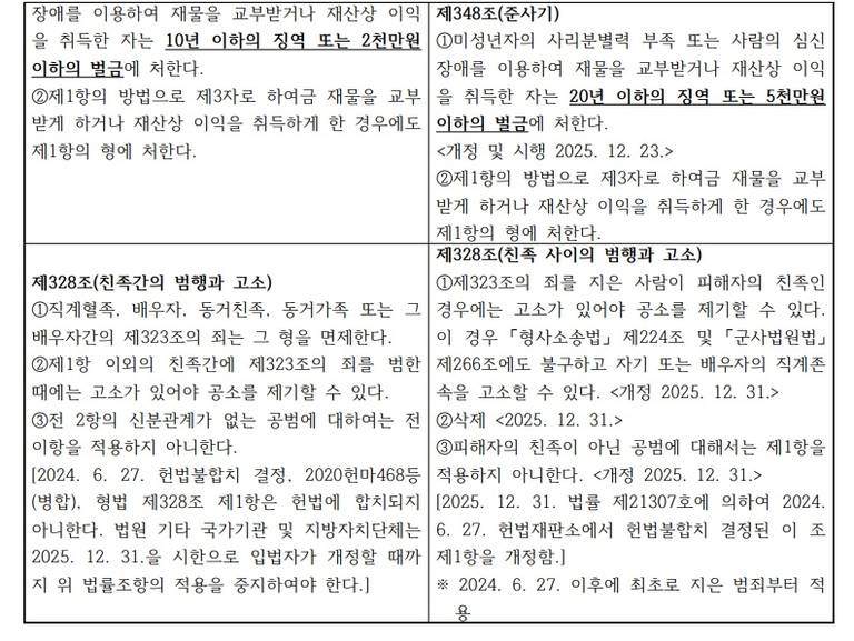 3. 직계혈족, 배우자 등에 대한 형을 면제하는 친족상도례가 폐지되고, 친족 전부에 대해 친고죄로 변경되었습니다.