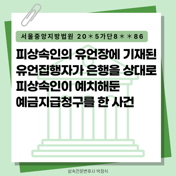 피상속인은 유언공정증서를 작성하여 일부 자녀들에게 자신의 모든 재산을 유증하였습니다. 이후 피상속인이 사망하면서 유언공정증서에 따라 배우자 명의의 예금채권 및 피상속인 본인의 예금채권이 유증받은 자녀들에게 유증되었습니다. 원고는 유언집행자로서 수증자인 자녀들에게 예금채권을 집행해주기 위하여 피고 금융기관들을 상대로 예금지급청구 소송을 제기하였습니다.