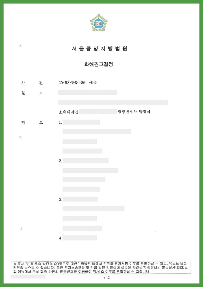 이에 재판부는 화해권고결정을 통해 원고의 청구를 일부 인용하여 피고들 각 은행에게 금원을 지급하도록 결정하였습니다. 이는 유언집행자인 원고가 수증자들을 위해 예금지급을 청구할 당사자적격이 있고, 유언에 따라 예금채권이 수증자들에게 유증되었음을 인정한 것입니다. 다만 재판부는 원고가 청구한 금액보다 약간 조정된 금액을 인정하였는데, 이는 당사자의 이익, 이자 내지 지연손해금 및 일부 지연손해금의 조정, 그 밖의 모든 사정을 참작한 것으로 보입니다.
