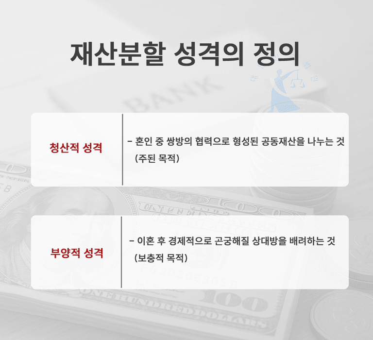 헌법재판소와 대법원은 재산분할의 성격을 두 가지로 정의합니다.