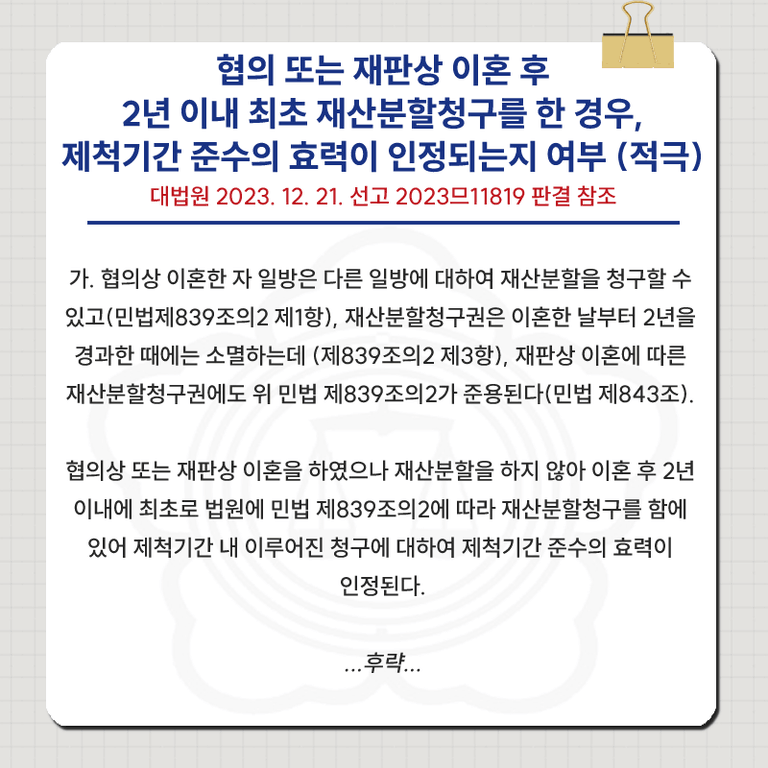 📌 대법원의 판단 : 제척기간 내에 재산분할 청구를 했다면, 그 이후 재산분할 대상을 추가하거나 특정하였더라도 제척기간을 준수한 것으로 보아야 한다.