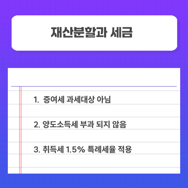▶️ 증여세 : 우리 법원은 재산분할을 '자신의 몫을 환수하는 것'으로 보기 때문에 공유물분할에 해당하여 원칙적으로 증여세 과세 대상이 아닙니다.