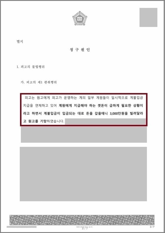 의뢰인(원고)은 피고가 계에 가입시켜 주겠다고 하며 3,000만 원을 차용