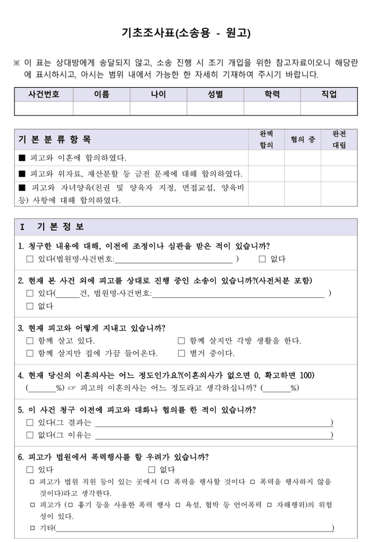 이혼 조정을 신청하면 소송과 마찬가지로 법원으로부터 '기초조사표(조정신청서용)' 작성을 요청받게 됩니다. 특히 조정은 당사자 간의 합의를 이끌어내는 과정인 만큼, 첫 단추인 이 조사표를 어떻게 작성하느냐에 따라 조정의 분위기가 완전히 달라질 수 있습니다.